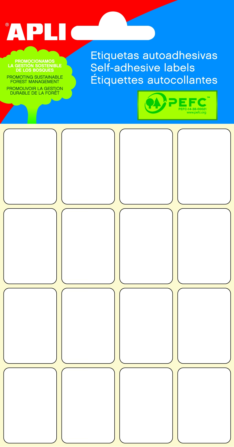 Samolepící etikety, obdélníkový tvar. Rozměr 19 x 27 mm. Permanentní. Malé balení v blistru, 96 ks, 6 listů.