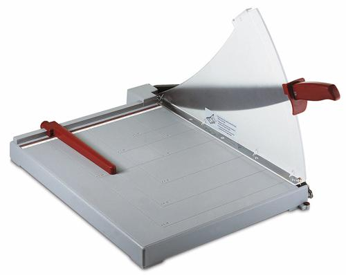 Hobby páková řezačka A3 s plastovým ochranným krytem a plastovým stolem s oděruvzdoirným povrchem ABS, vyznačenými měřítky a DIN formáty a posuvným dorazem papíru se šroubovou aretací.