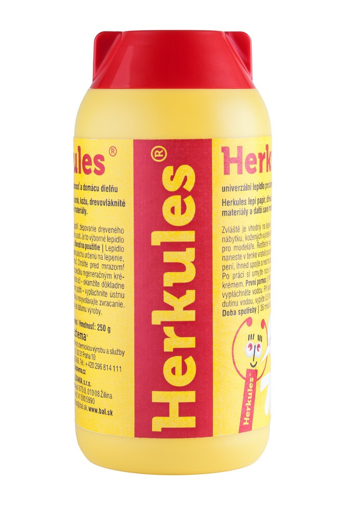 Herkules 500 g – určený pro lepení papíru, korku, kůže, dřeva a dřevovláknitých materiálů. Zvláště vhodný k lepení fotografií, slepování dřevěného nábytku, kožených výstelek obuvi apod. Je vhodný pro domácnost, dílnu i pro modeláře, nevýbušný, nehořlavý. Spotřeba cca 300 g/m2, podle lepeného materiálu. Technické parametry: pH 4 až 6 sušina min. 30% pevnost slepu ve smyku ( dřevo/dřevo) min. 8MPa. Doba otevřenosti 10 min., doba zasychání 15 min. Neobsahuje organická rozpouštědla ani fungicidní přísady.