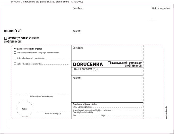 Obálka 162 mm x 217 mm pro doručování podle zákona 500 / 2004 Sb. (správní řád) s vytrhovacím okénkem.