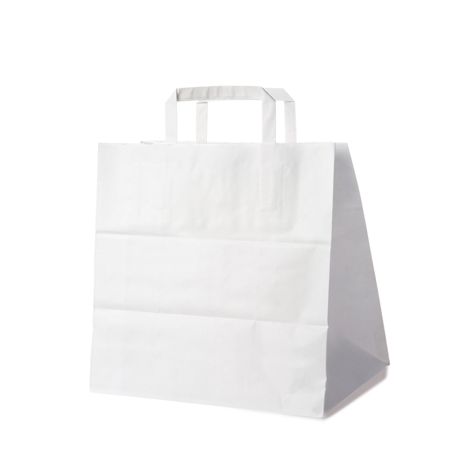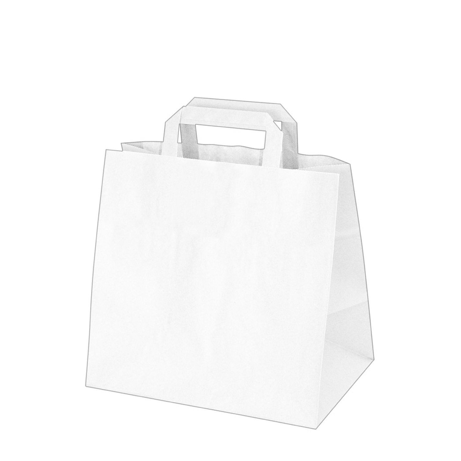 Papírová taška bílá 32+21 x 33 cm, 50 ks v balení. Cena je uvedená za balení. Celá krabice obsahuje 5 balení.