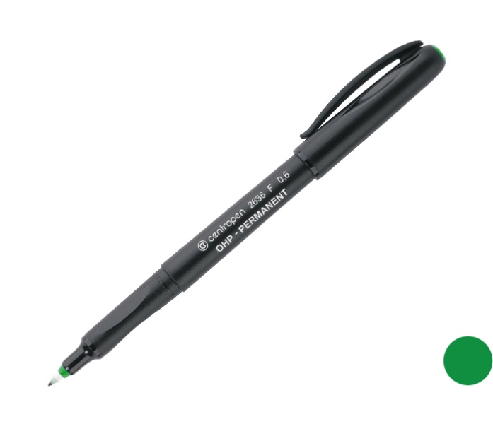 Speciální permanentní popisovač s ergo držením, určený pro psaní na neporézní povrchy jako jsou fólie pro zpětné projektory, film, fólie, kov, plast, pryž, sklo, porcelán. Permanentní inkoust na alkoholové bázi, otěruvzdorný, vodou nesmývatelný. Písmo lze odstranit lihem, ventilační chránítko. Po použití uzavřít. Barva: zelená Šíře stopy: 0,6mm Jemný hrot v plastové objímce