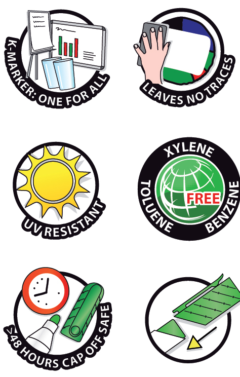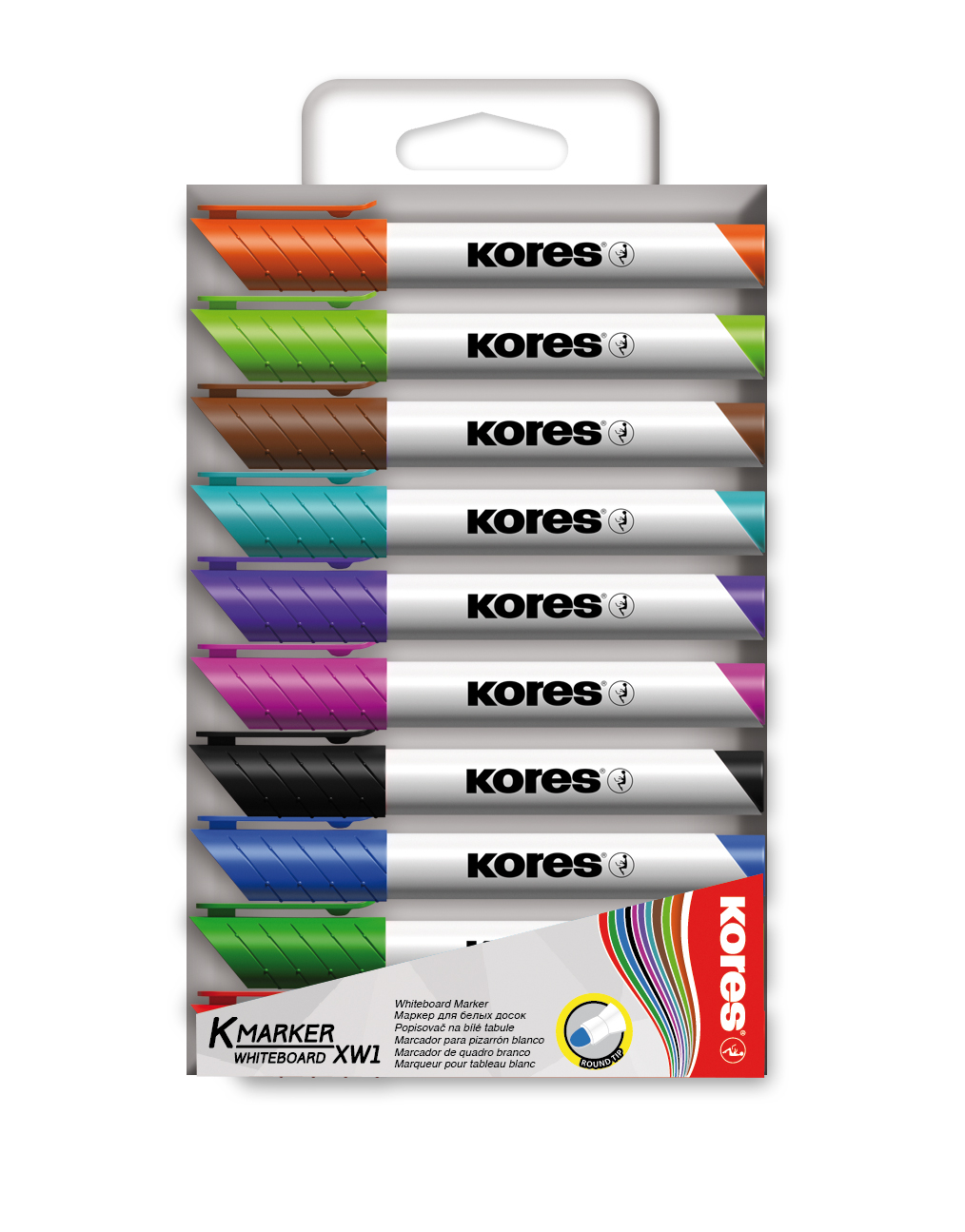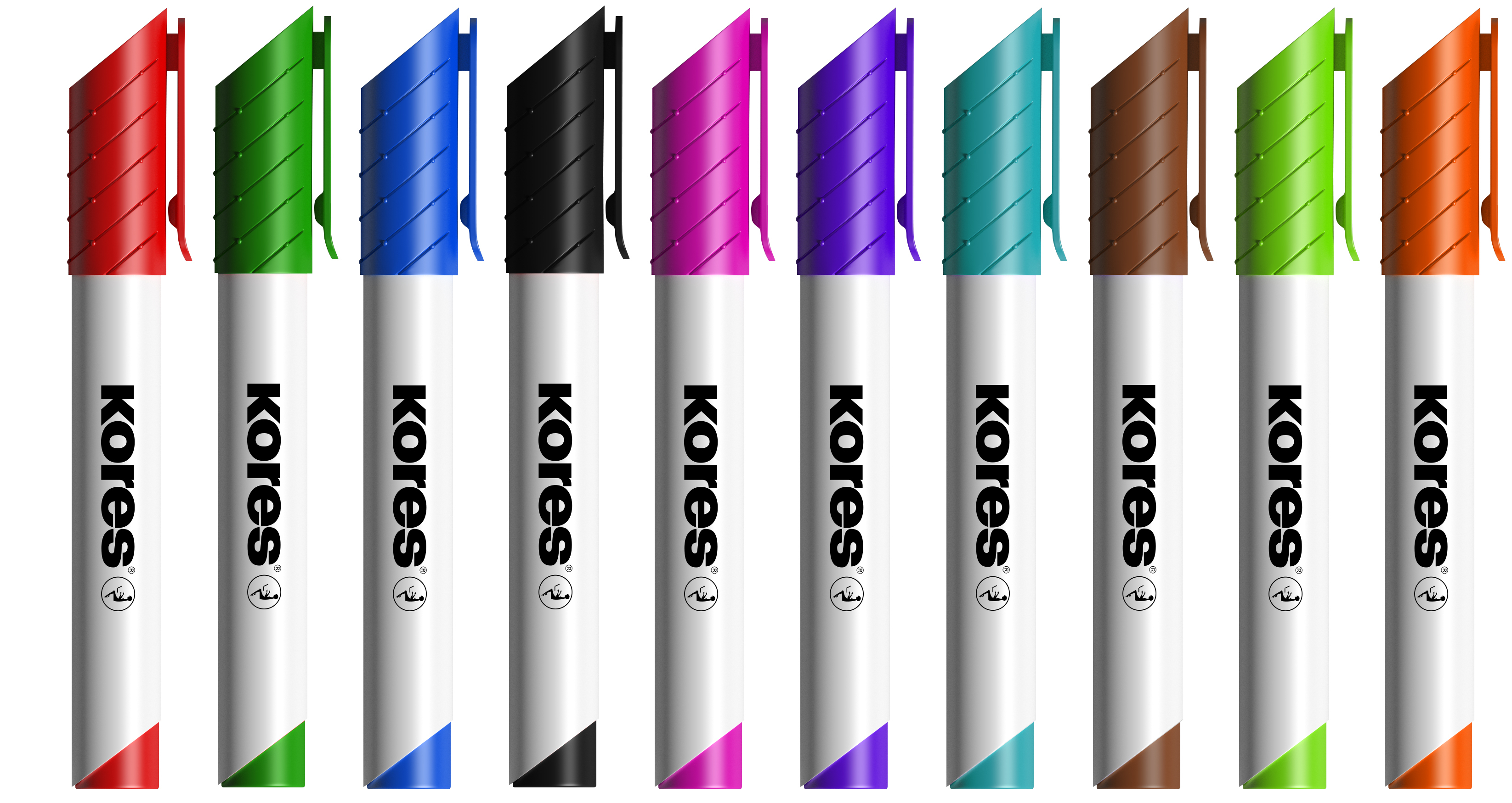 Popisovače K-MAKER na bílé tabule od značky KORES. Kulatý hrot 3mm, mix 10 barev (černá, červená, modrá, zelená, růžová, tyrkysová, oranžová, hnědá, fialová, světle zelená).