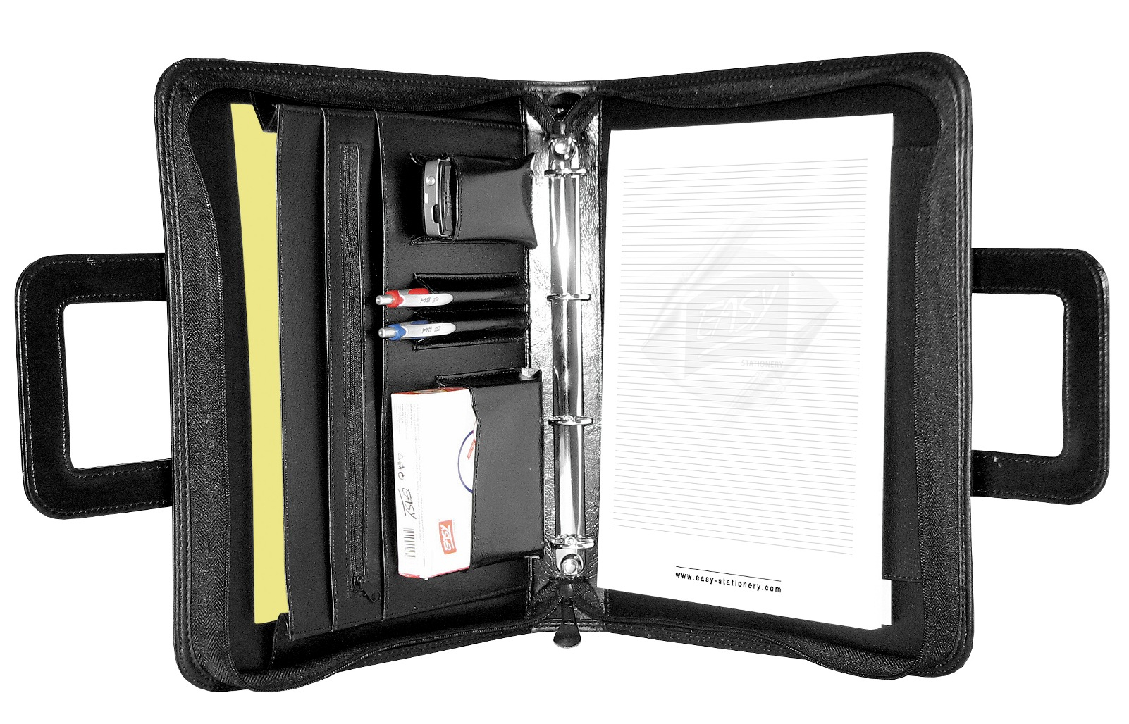 Konferenční deska A4 s vysouvatelnými uchy. -barva černá, ekokůže Portfolio zahrnuje: čtyř-kroužkový pořadač, 2 kapsy na doklady, dvě menší kapsy, jedna na zip, 2 místa pro pera, kapsa pro mobil, notebook., EAN samostatného výrobku: 5907640889871