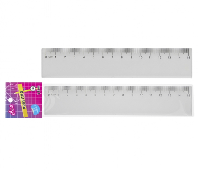 Klasické rovné pravítko - nezbytná pomůcka školáků, ale hodí se i do kanceláří a domácností, z pevného transparentního plastu, délka 15 cm (vhodné do penálů).