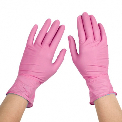 Jednorázové nitrilové rukavice „Espeon“ nepudrované, růžová barva, pravo-levé, nesterilní, atest pro potravinářství, velikosti XS, S, M, L, XL.