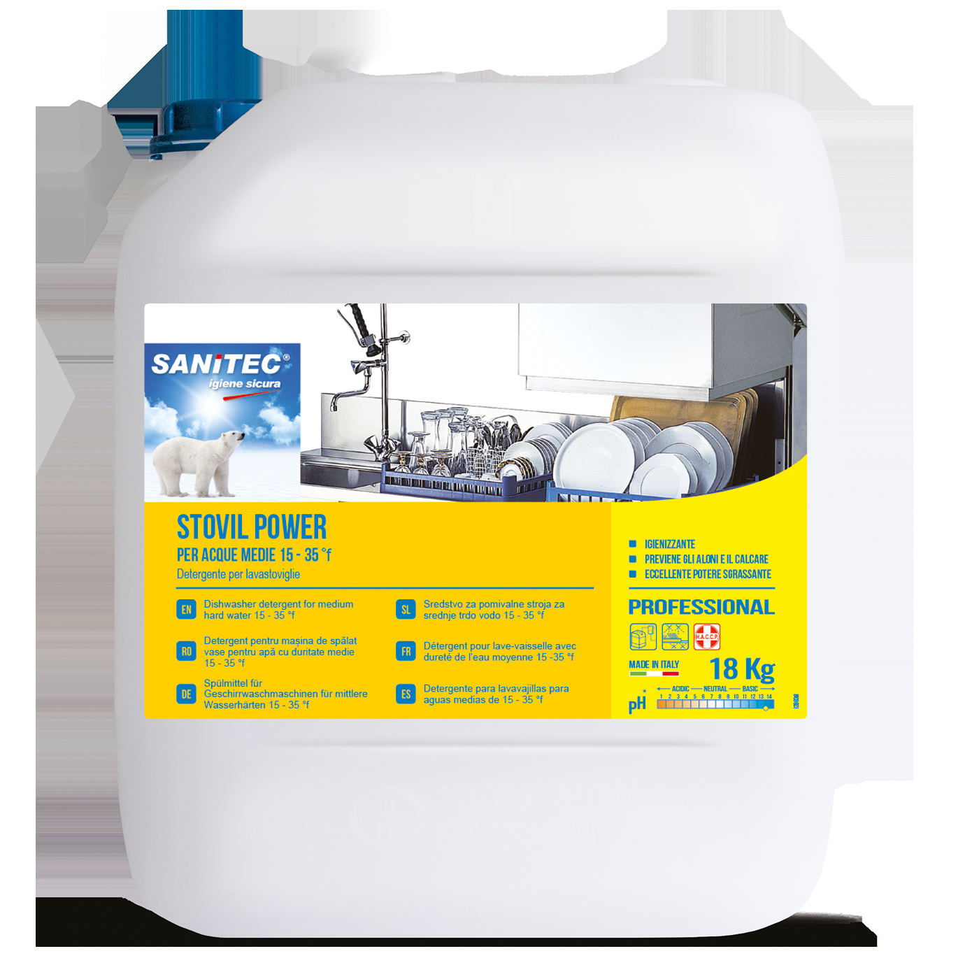 SANITEC STOVIL POWER Alkalický mycí prostředek pro průmyslové myčky nádobí s automatickým dávkovacím systémem. Vynikající odmašťovací schopnost na mastnoty, škrob atd. Zabraňuje tvorbě vápenatých usazenin na nádobí a i na myčce. Na nádobí nezůstávají skvrny od vody.