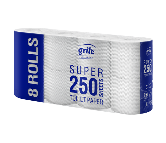 Jemný bílý toaletní papír Grite, 100% celulóza, 3-vrstvý. Návin 27,5 metru, 250 útržků.